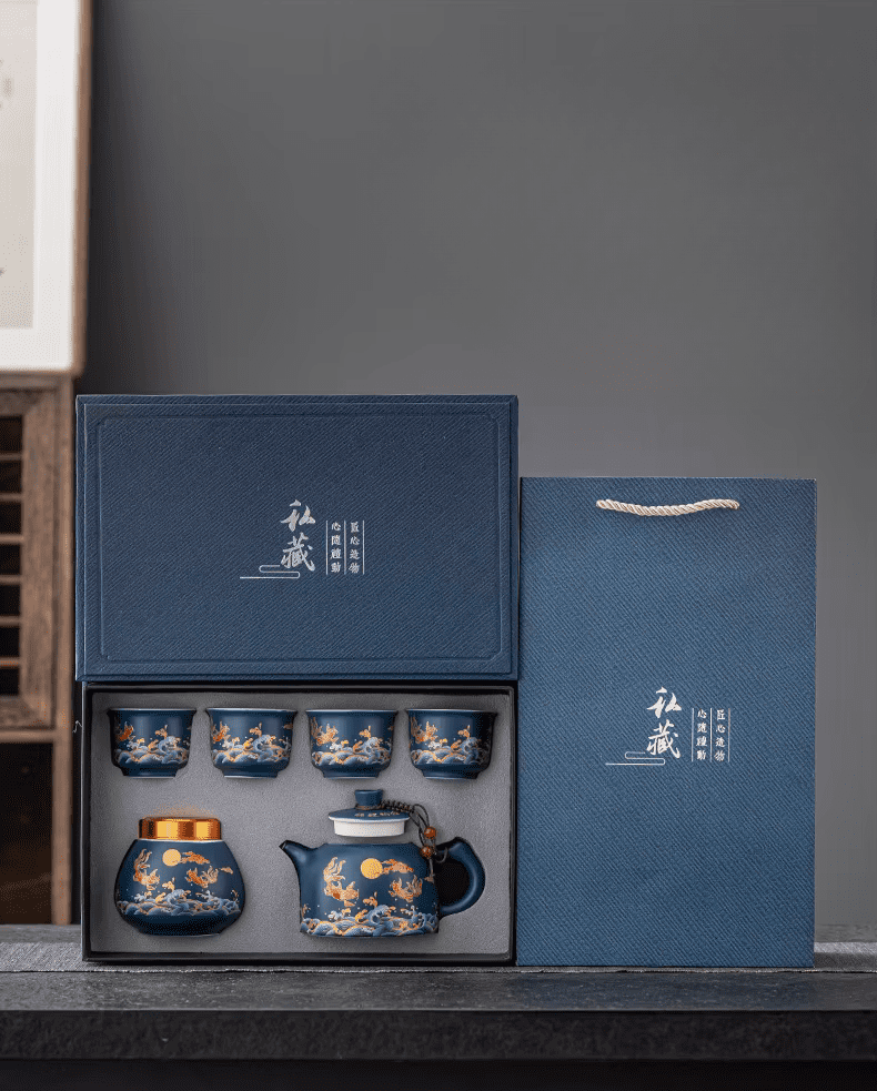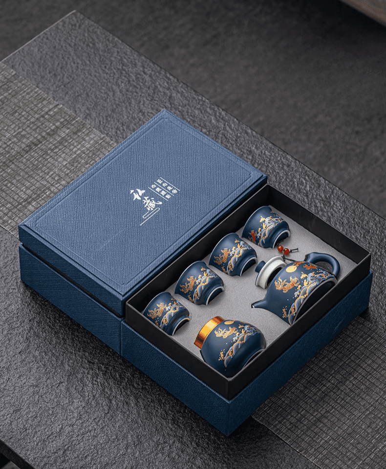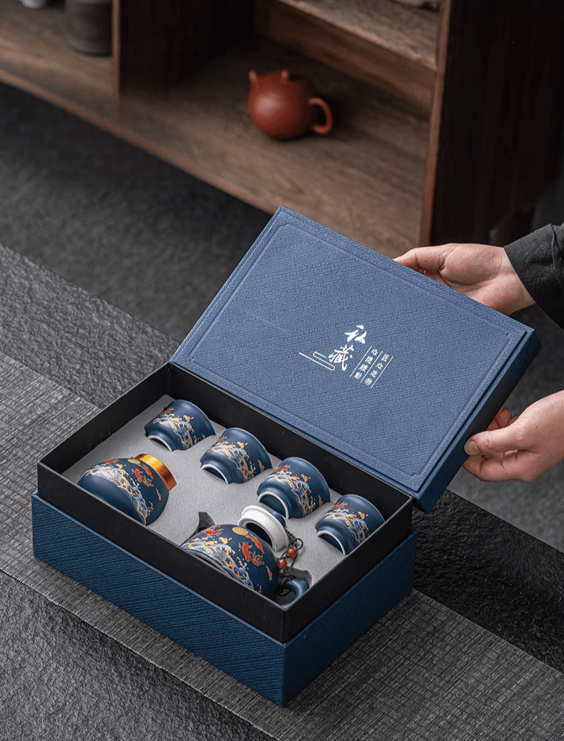 Pełen komplet – Zestaw obejmuje dzbanek (220 ml), 4 czarki (60 ml) i puszkę na herbatę (180 ml), zamknięte w ozdobnym pudełku prezentowym.