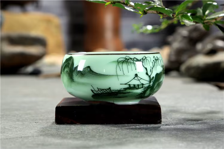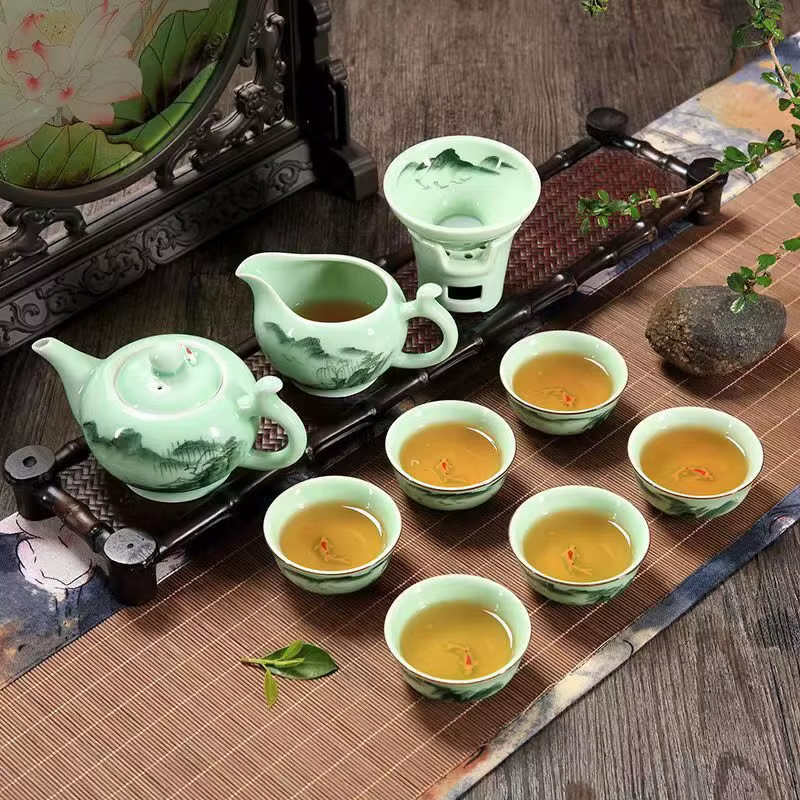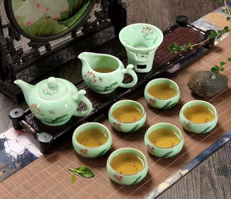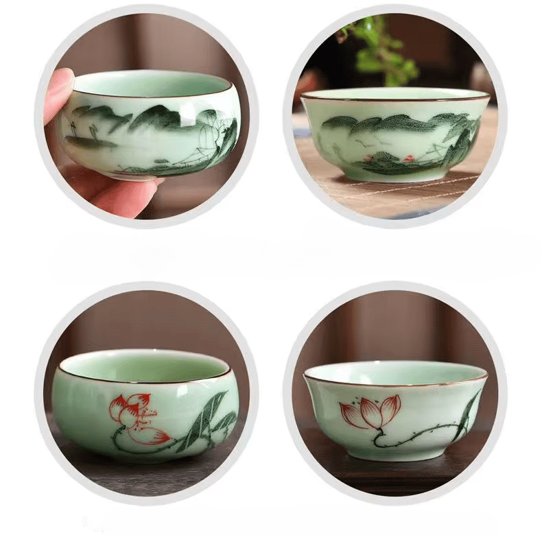 Tradycyjny Chiński Zestaw do Herbaty – Ręcznie Robiony Celadon z Motywem Lotosu lub Krajobrazu