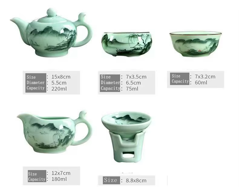 Specyfikacja: Tradycyjny Chiński Zestaw do Herbaty – Ręcznie Robiony Celadon z Motywem Lotosu lub Krajobrazu