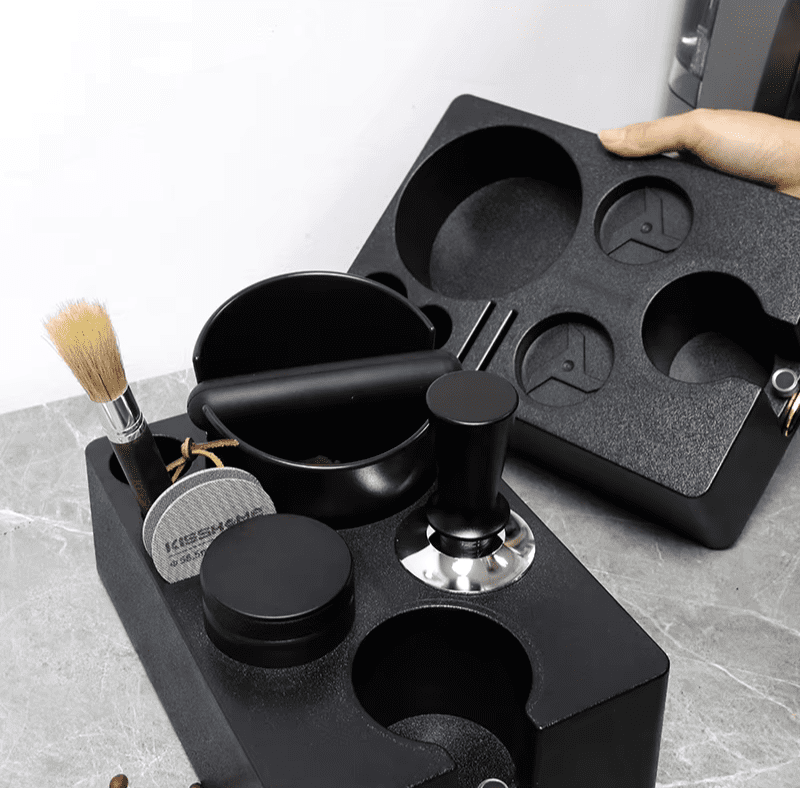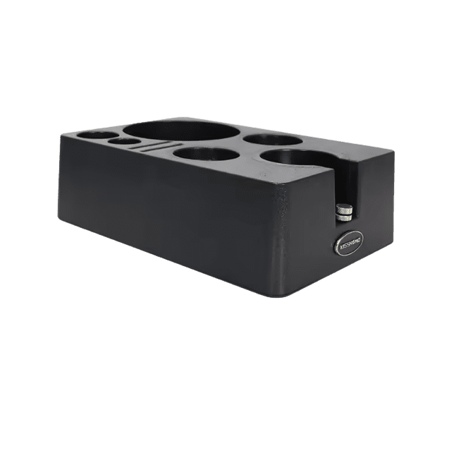 Organizer akcesoriów: Wyprofilowane otwory pomieszczą tamper, dystrybutor WDT oraz szczoteczkę, gwarantując porządek i wszystko pod ręką.