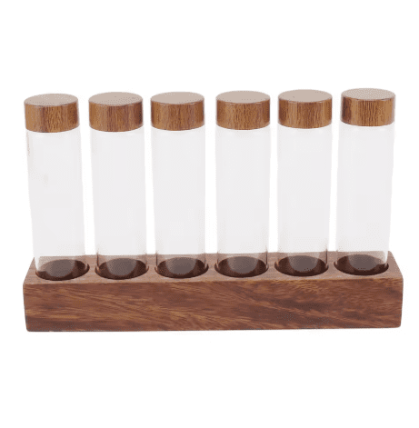 Minimalistyczny design – Elegancka forma probówek z naturalną bambusową pokrywką i drewnianym stojakiem pasuje do nowoczesnej kuchni, biura lub restauracji.