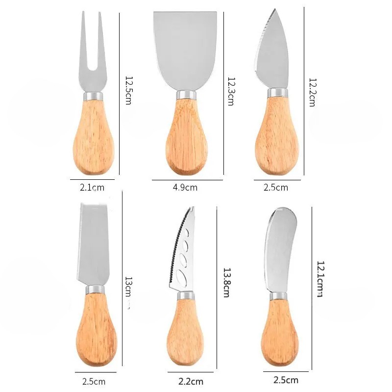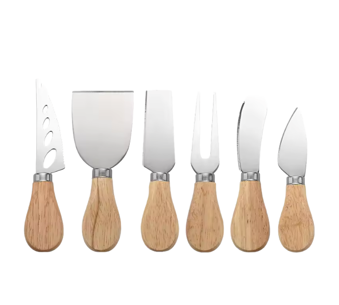 Specyfikacja: Zestaw 6 noży do sera – stal nierdzewna i drewniane uchwyty dla miłośników serów