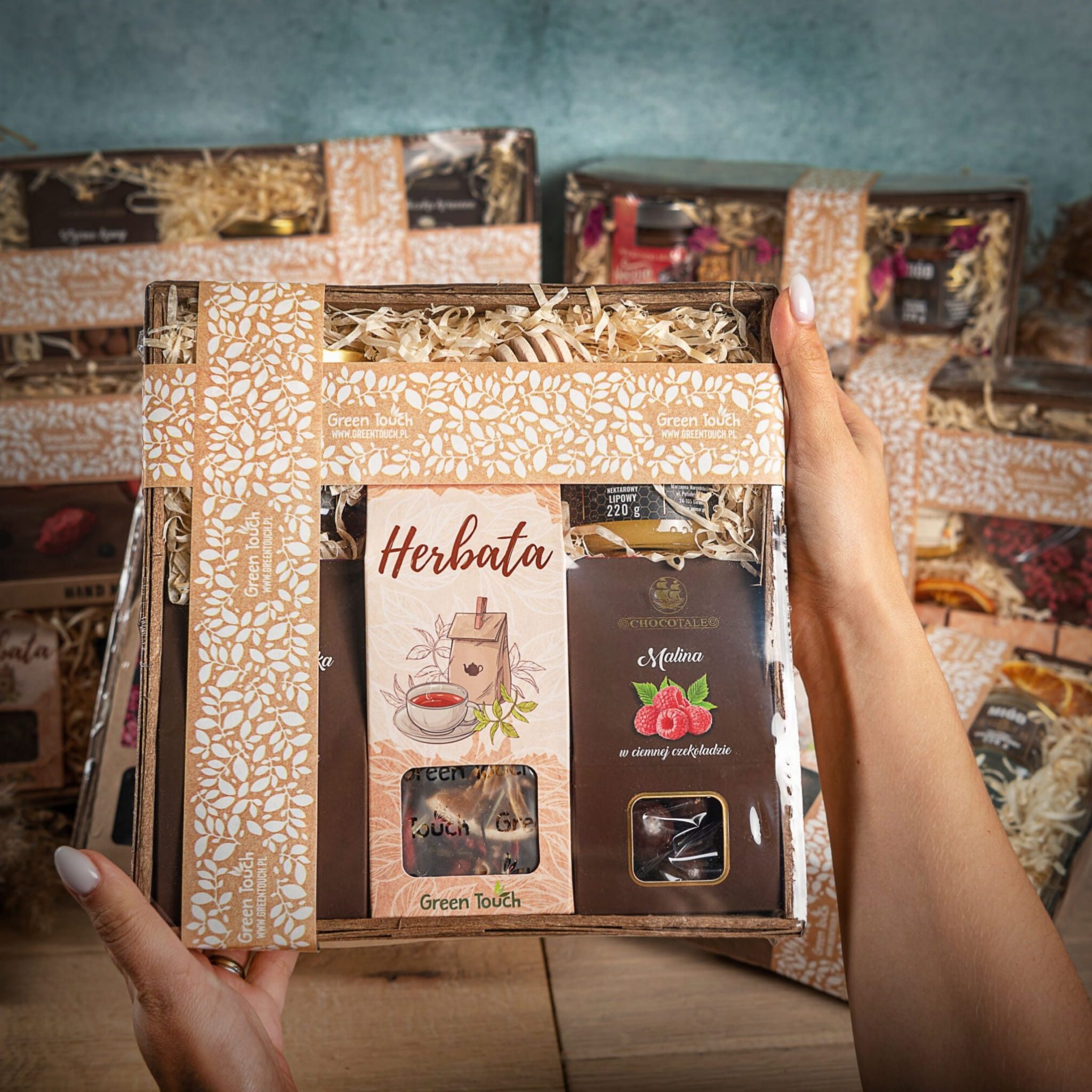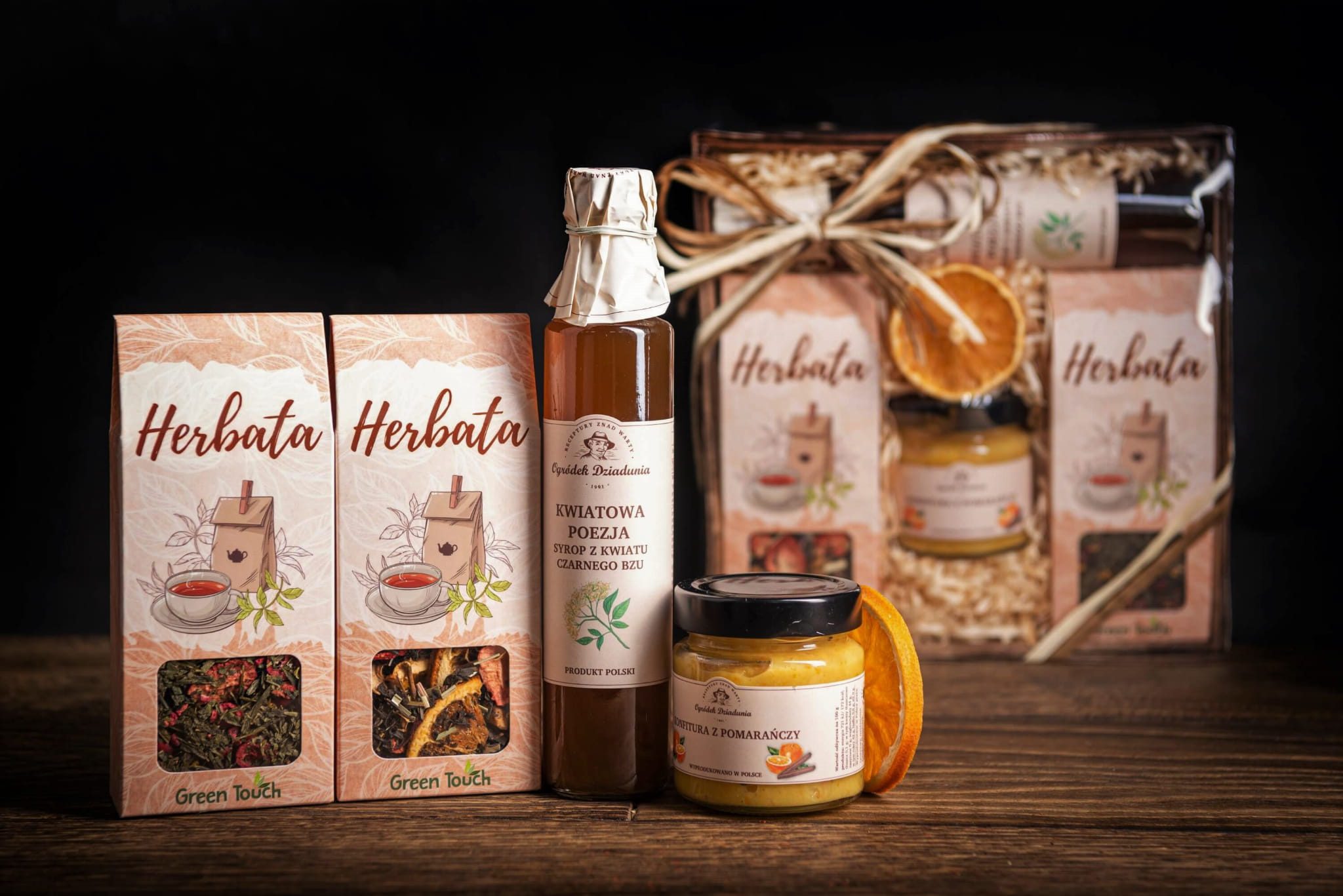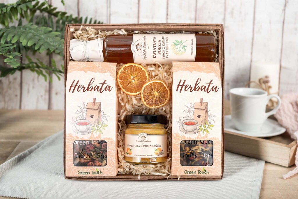 Kosz prezentowy z naturalnymi przetworami i herbatą