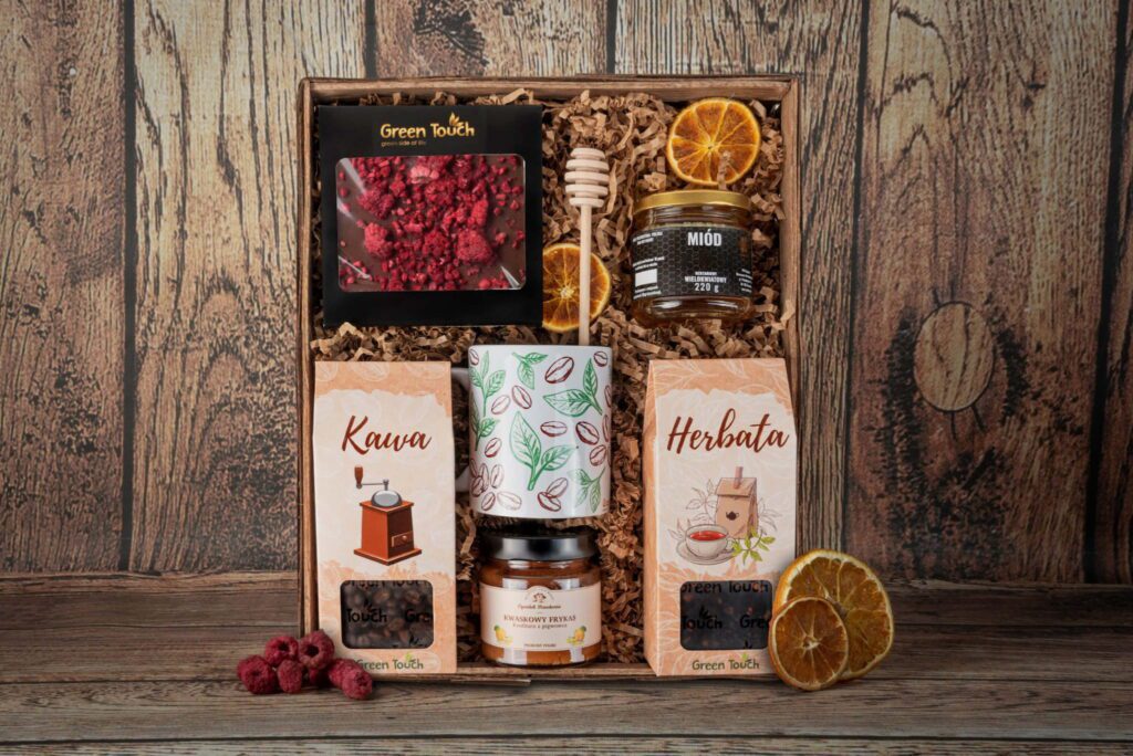 Kosz prezentowy – zestaw z herbatą, kawą, słodyczami, konfiturą i kubkiem
