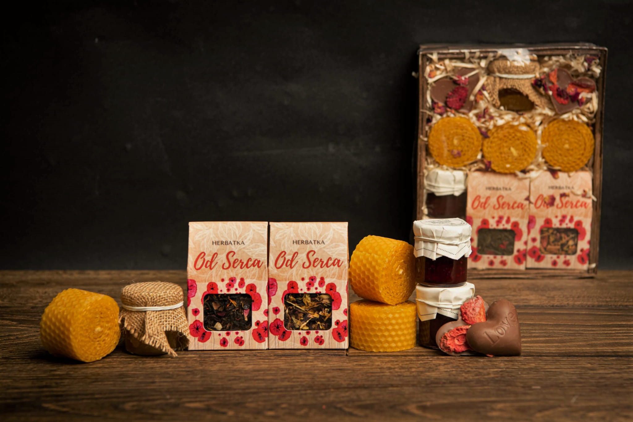 Mały kosz prezentowy z herbatą, konfitury, świece z węzy, miód